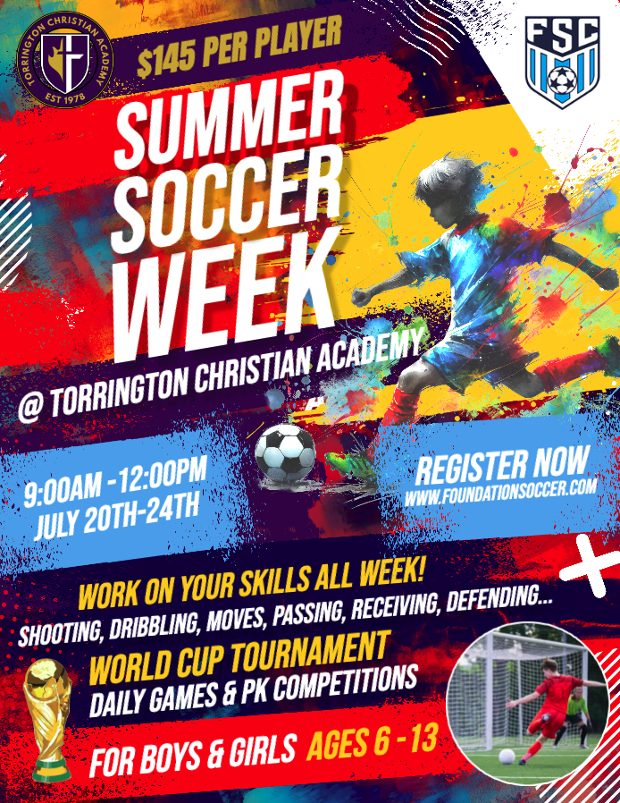 Summer Soccer week held at Torrington Christian Academy July 20th to 24th from 9-12.